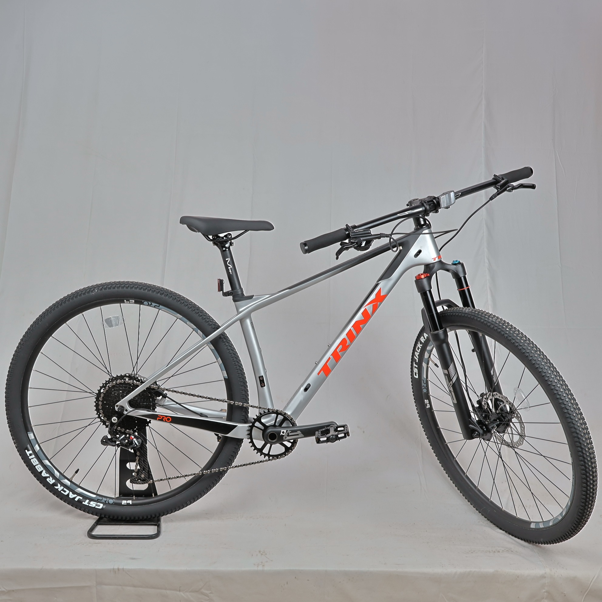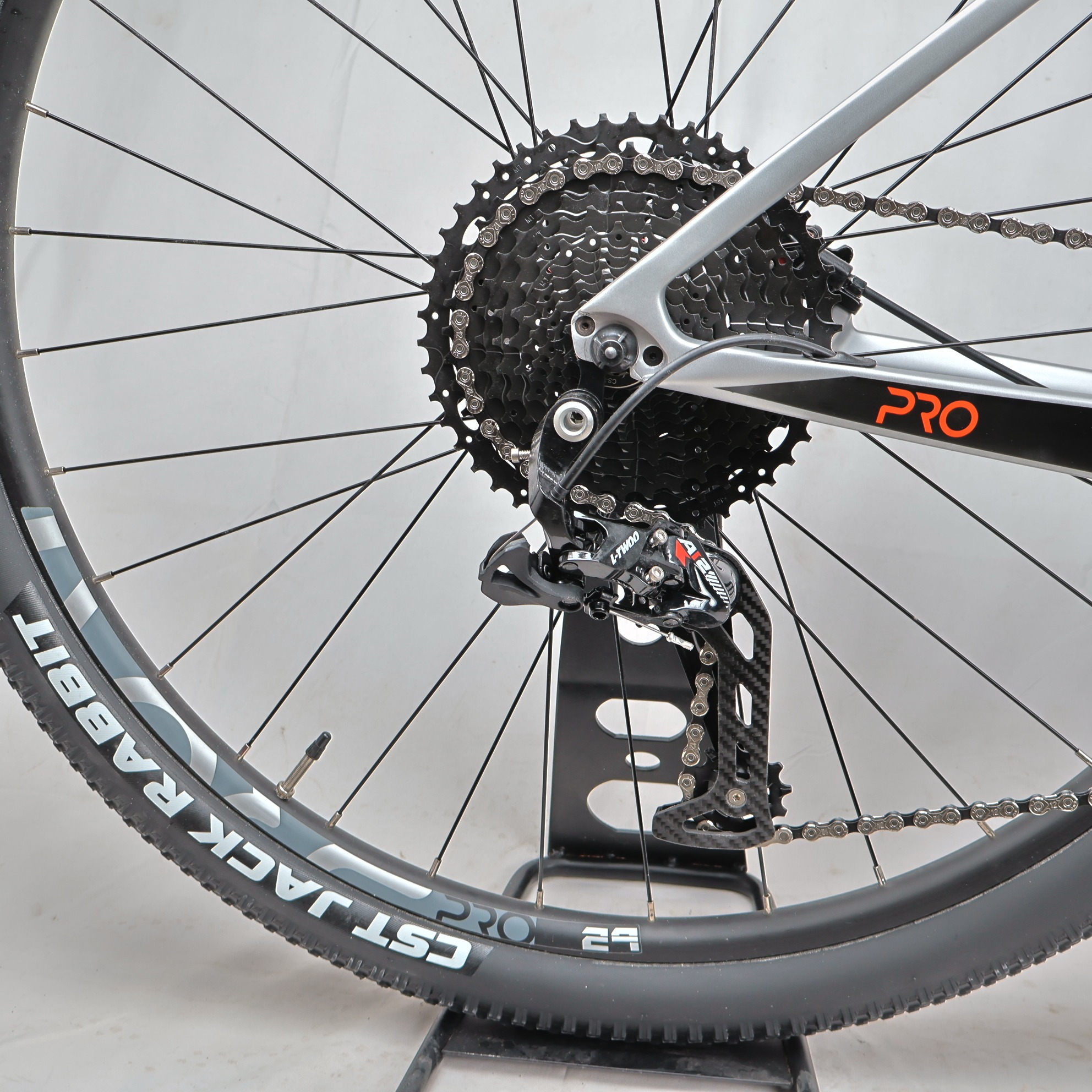 Hi-modulus T700 carbon 29″ frame for lightweight strength and responsive ride quality.